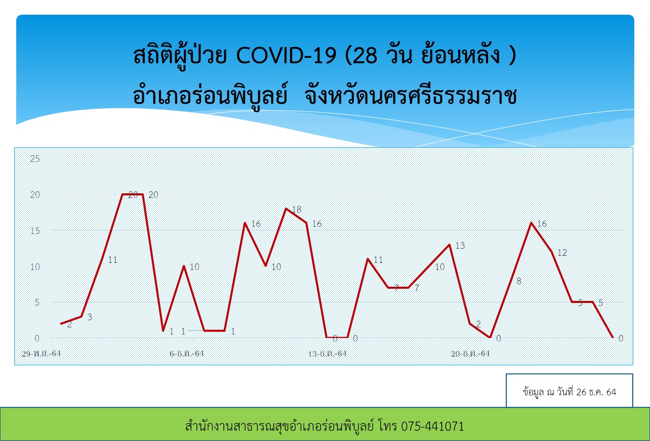 สถานการณ์โรค COVID-19 อำเภอร่อนพิบูลย์ ตั้งแต่วันทีี่ 15 เมษายน - 26 ธันวาคม 2564 มีผู้ป่วยในพื้นที่ จำนวน 1911 ราย รักษาหาย 1935 ราย กำลังรักษา 84 ราย เสียชีวิต 11 ราย