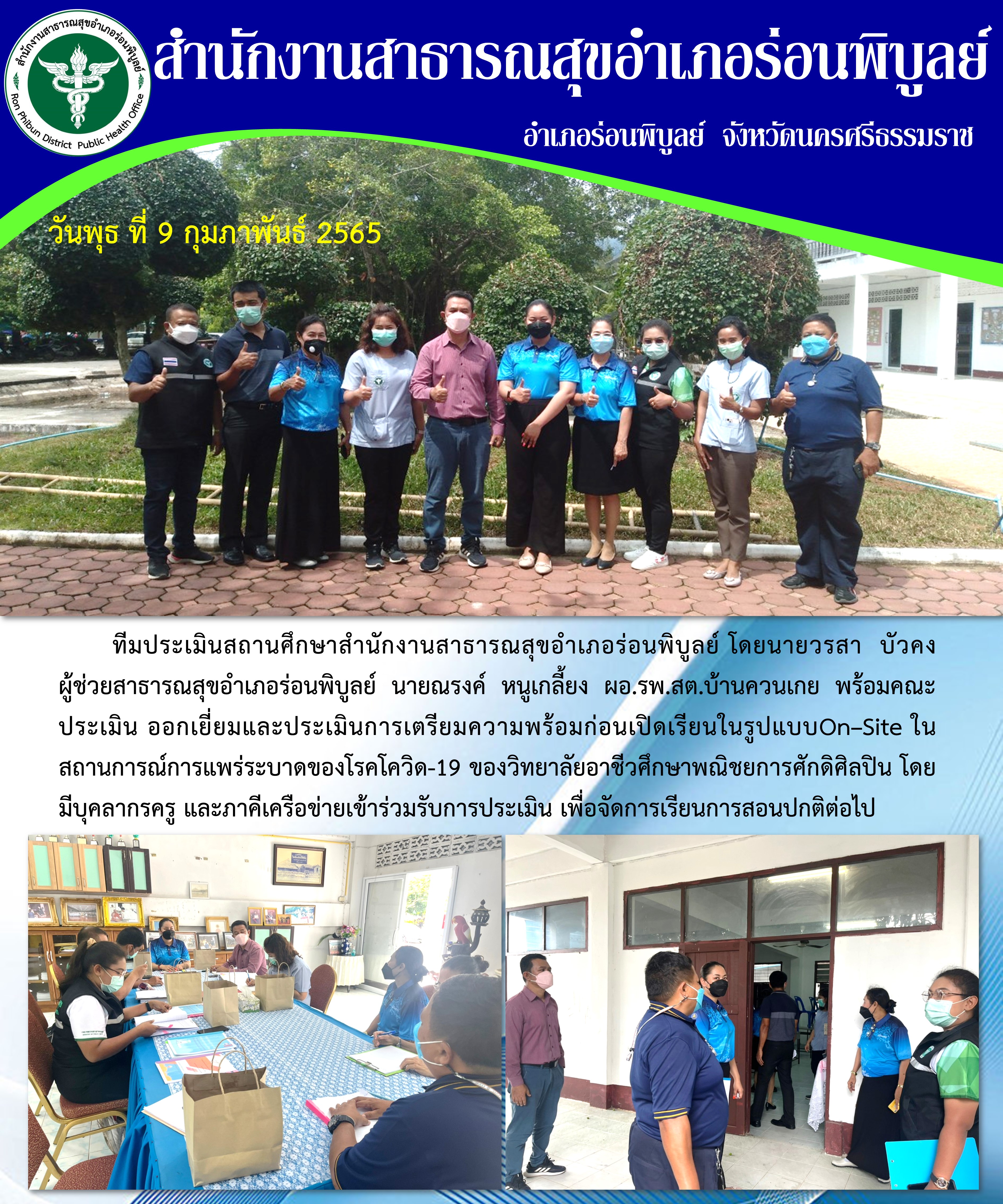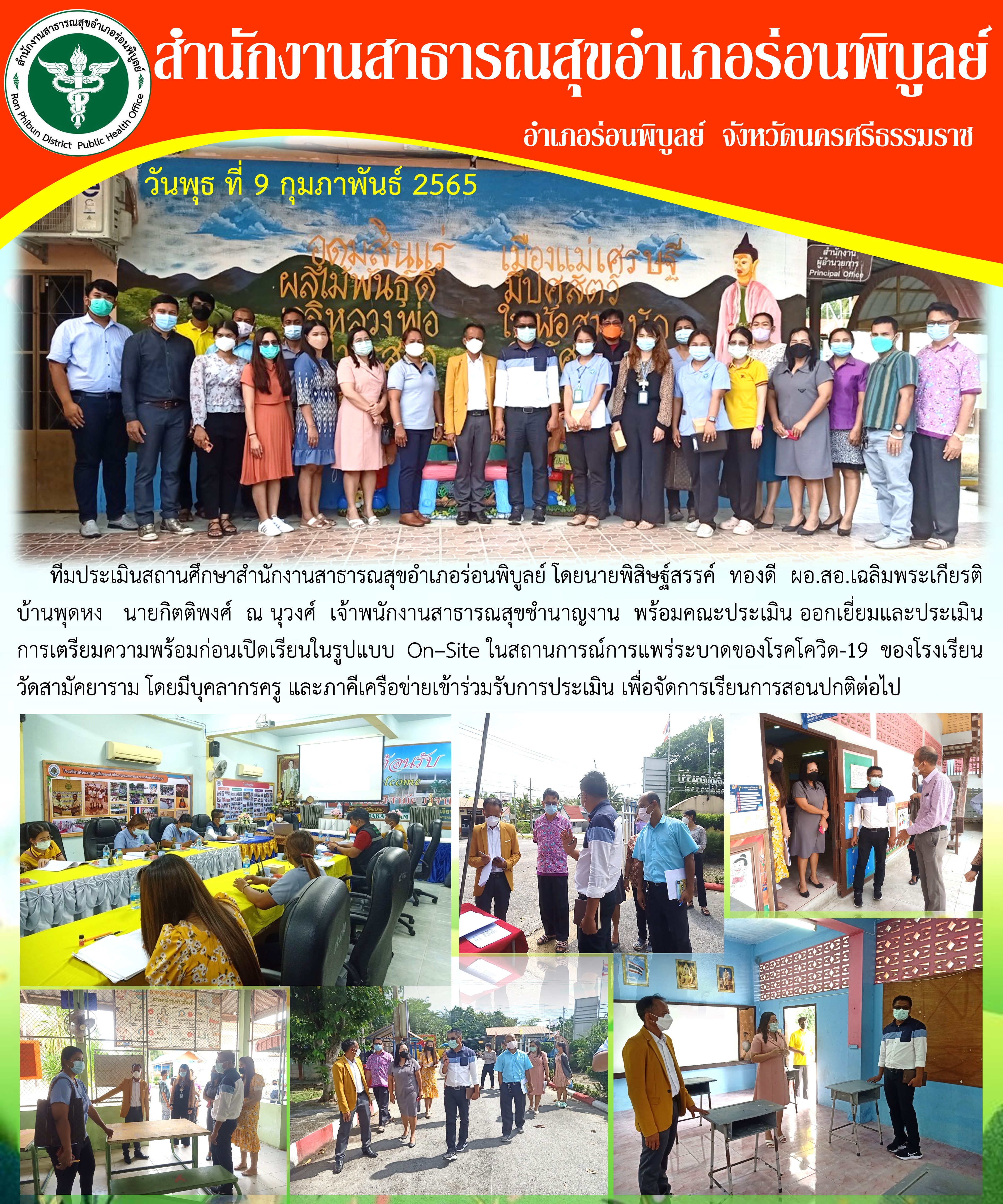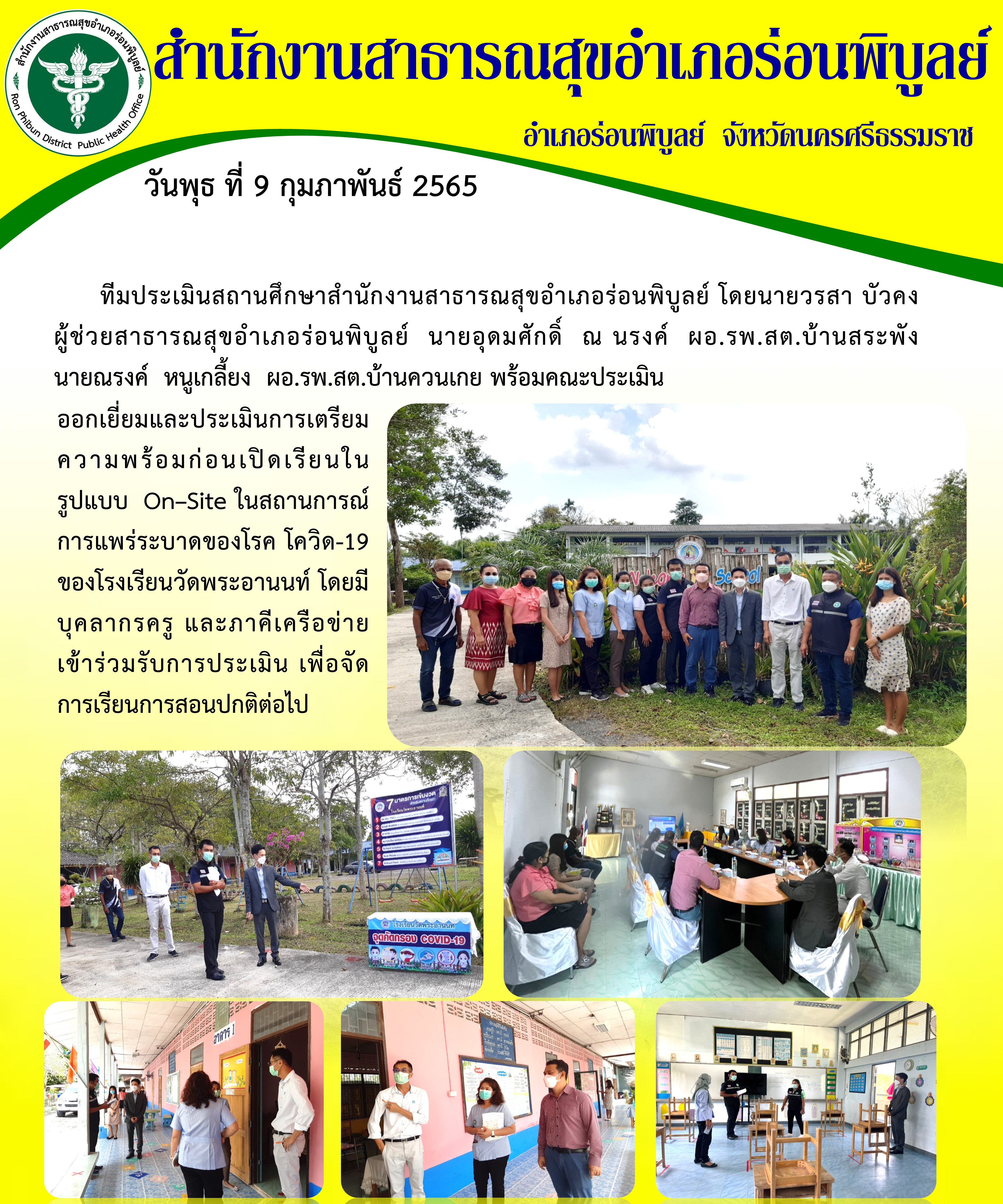วันที่ 9 กุมภาพันธ์ 2565 ทีมประเมินสถานศึกษาสำนักงานสาธารณสุขอำเภอร่อนพิบูลย์ ออกเยี่ยมและประเมินการเตรียมความพร้อมก่อนเปิดเรียนในรูปแบบ On–Site ของโรงเรียนร่อนพิบูลย์ วิทยาลัยอาชีวศึกษาพณิชยการศักดิศิลปิน วัดพระอานนท์ โรงเรียนวัดสามัคยาราม