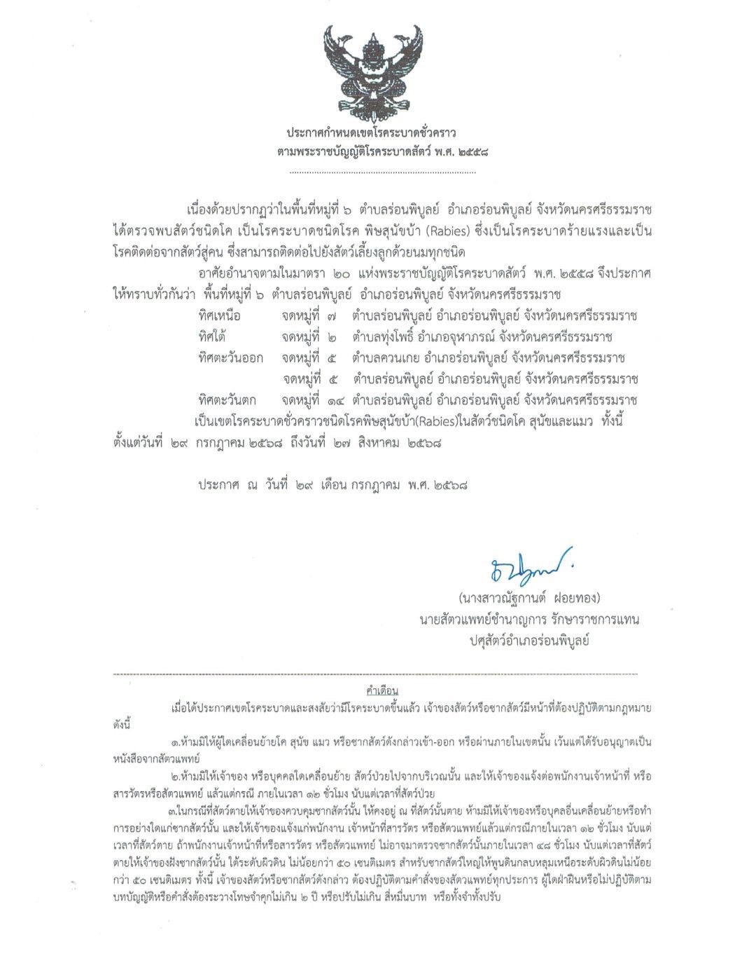 #เนื่องด้วยพื้นที่หมู่ที่ 6 ตำบลร่อนพิบูลย์ ได้ตรวจพบสัตว์ (โค) ติดเชื้อโรคพิษสุนัขบ้า ซึ่งเป็นโรคระบาดร้ายแรงและเป็นโรคติดต่อจากสัตว์สู่คน